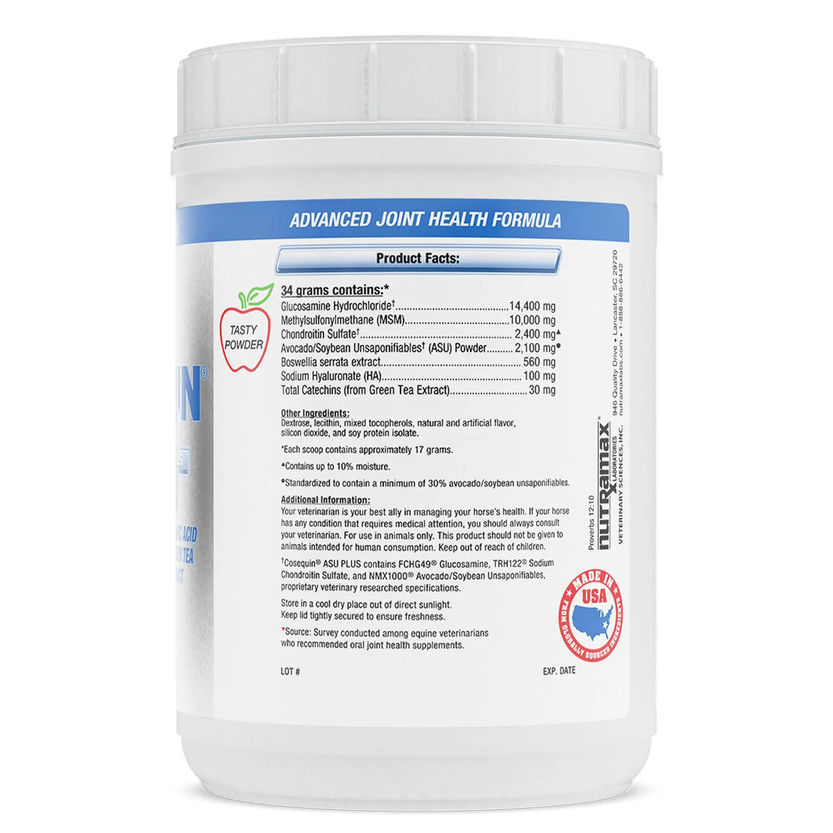 Cosequin ASU Plus by Nutramax contains the same ingredients as Cosequin ASU with the addition of HA and Green Tea Extract. HA is an ingredient that helps lubricate the joints. Green Tea Extract is an antioxidant that protects the body from the effects of free radicals. Cell culture research shows that these ingredients together inhibit many mediators that contribute to the breakdown of cartilage. New cutting edge cell culture data shows that this combination of ingredients even inhibits NF-kappaB, a mediator that helps “”turn on”” the other mediators and so starts the process resulting in cartilage breakdown and less joint comfort. Cosequin ASU Plus truly is an advanced formula providing comprehensive joint health support.